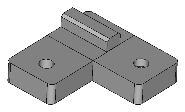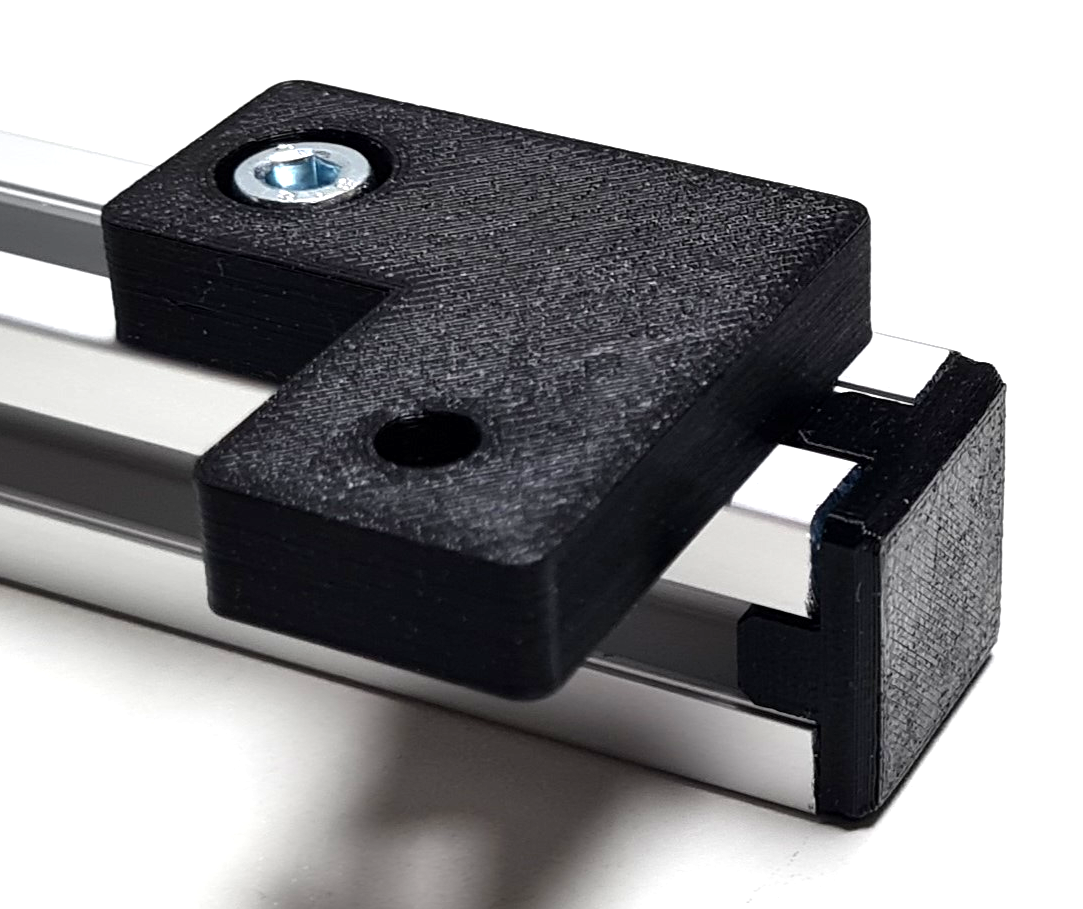 The 3D-1031 print part is used to fasten a 20 mm profile to plate material, such as the bottom of a housing. The 3D-1031 fastener is screwed to the profile with the aid of an SM-5x8 cylinder head screw and an SN-20-M5 slot nut (see pictures »Fastening« and »Accessories«). The laterally protruding lug has a hole for an M4 screw and sufficient space for an M4 washer, which can then be used to fasten it to the panel material. The type and length of the screw must be selected according to the requirements of the panel material.