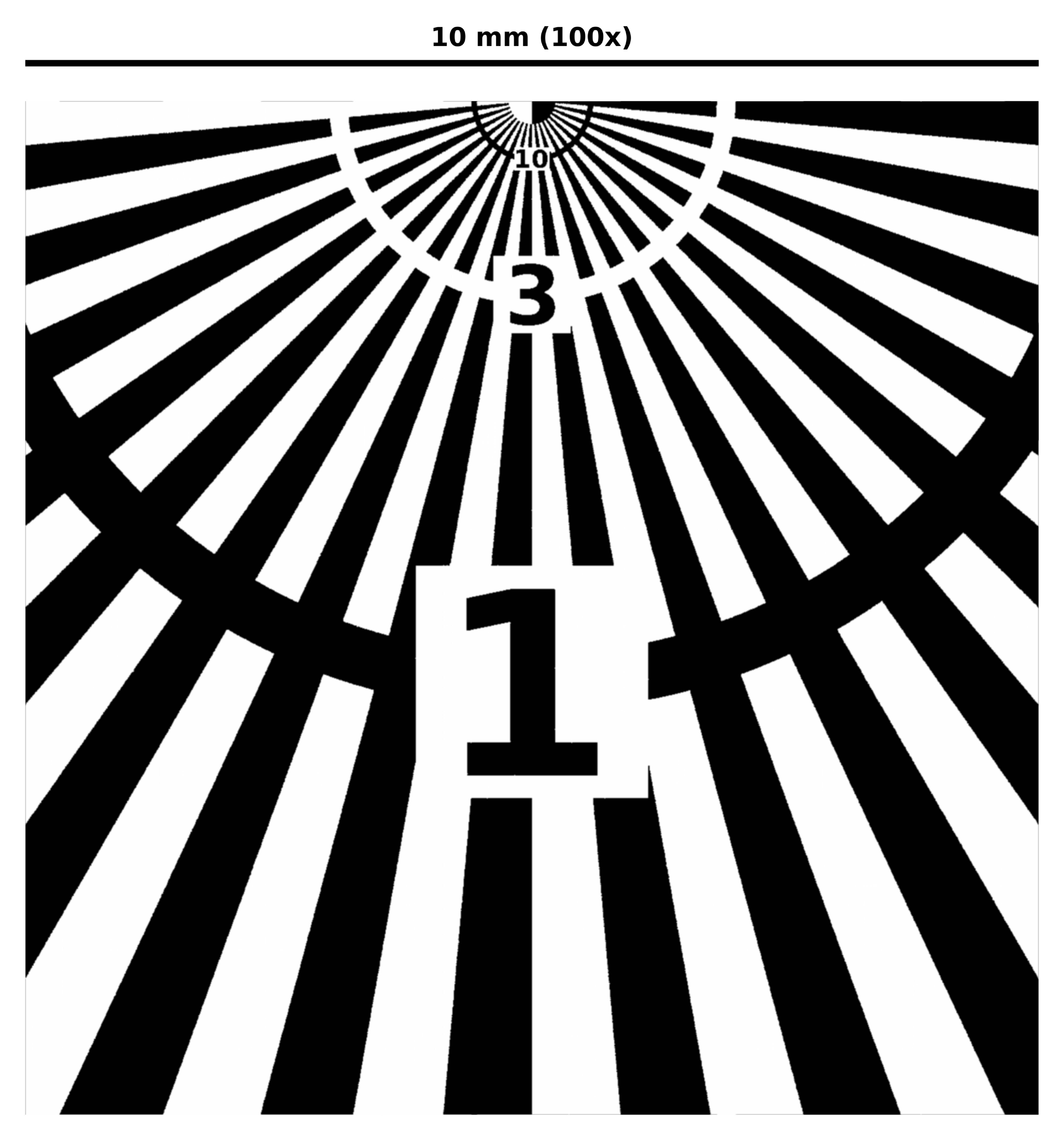 For assessing the resolution capabilities of, for example, optics and cameras, we offer test targets on which test structures with different resolutions are present. Two versions are currently available as standard.