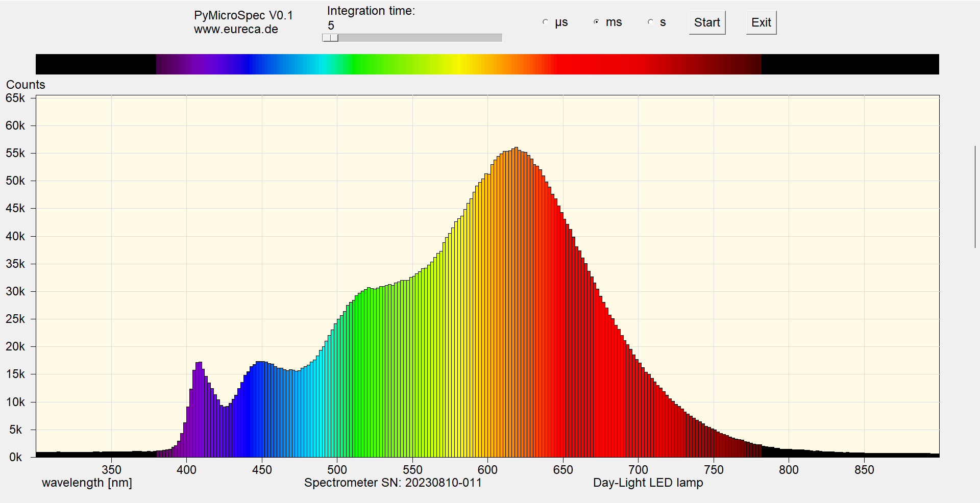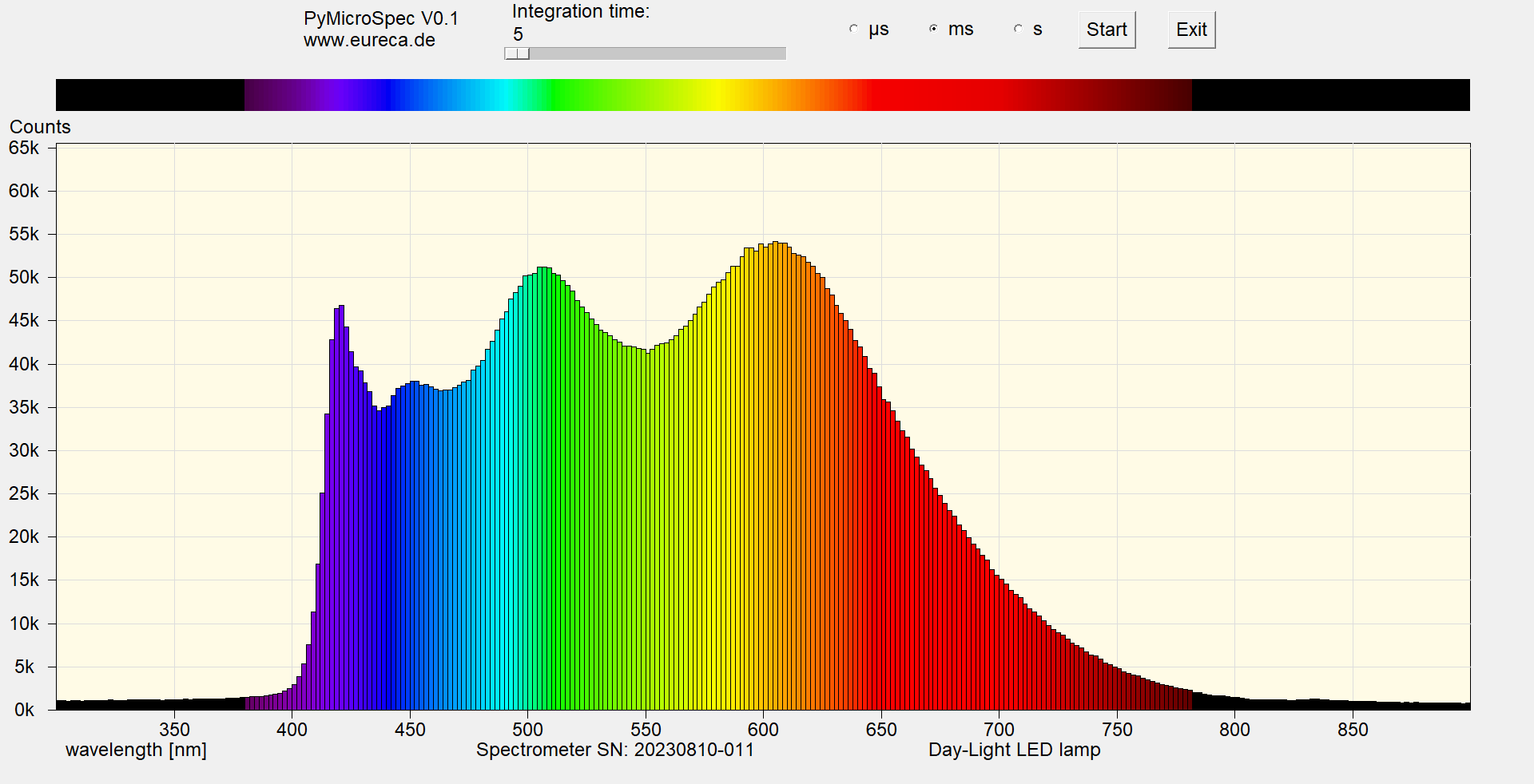 We deliberately used our microspectrometer for our measurements rather than the DIY Czerny-Turner spectrometer with its higher spectral resolution. The reason for this lies in the purpose of the application: when observing LED spectra, the aim is not so much to resolve fine line structures or narrow peaks in detail, but rather to represent the rough spectral composition across the entire visible range. The microspectrometer delivers results very quickly and reliably and, thanks to its compact design and ease of use, is ideal for use in the classroom. Especially when conducting experiments with students and interns, it is advantageous to be able to take measurements without tedious adjustments and with immediately understandable displays.