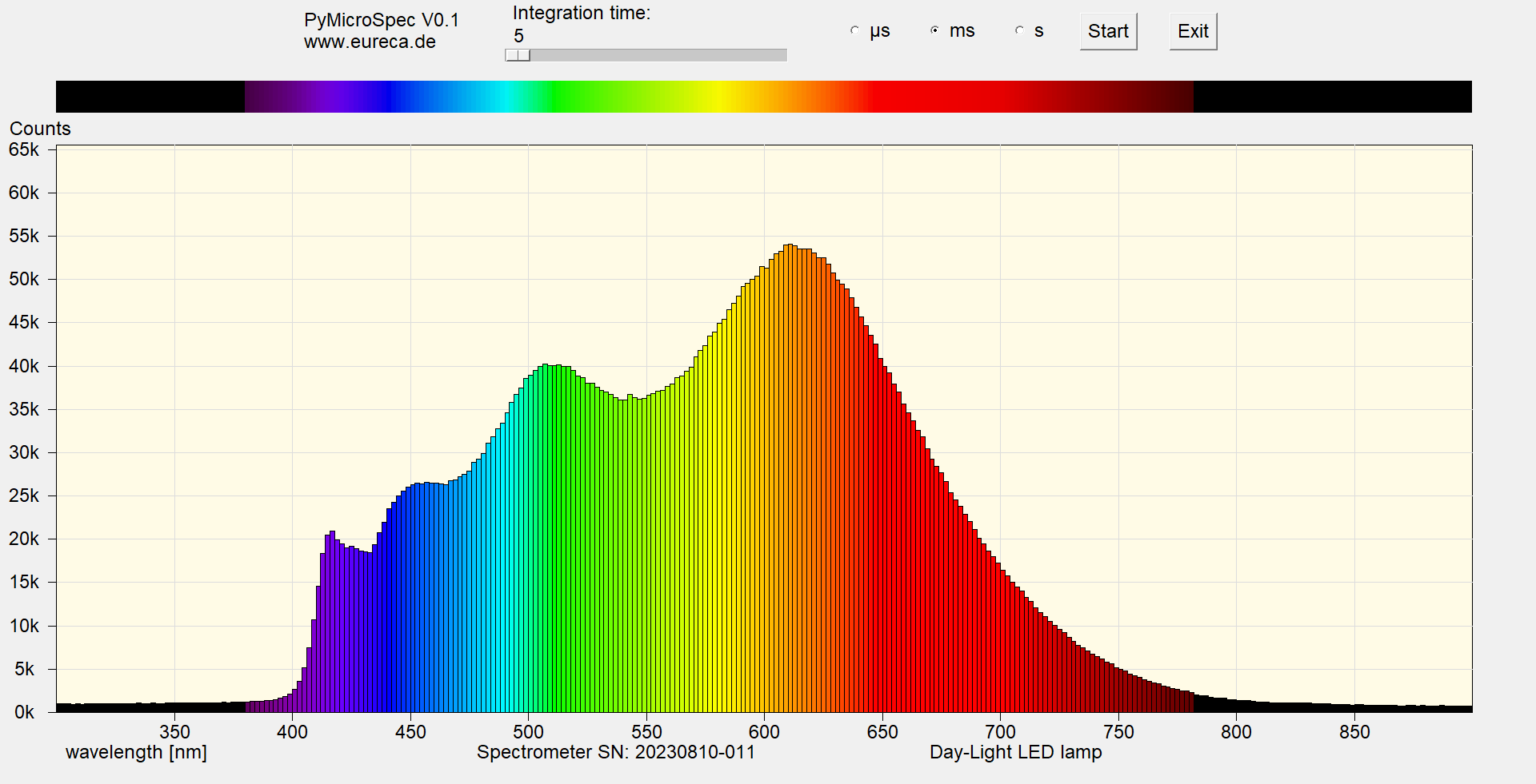 The spectra shown in this application example are raw data from our microspectrometer. This means that they have not yet been spectrally corrected, i. e., the sensitivity differences of the detector across different wavelengths have not been taken into account. However, such a correction is not absolutely necessary for a rough classification of color temperatures, as the typical differences between warm white, neutral white, and cool white LED light are clearly visible even without complex post-processing. It is precisely this immediacy that makes the experiment particularly illustrative for use in teaching.