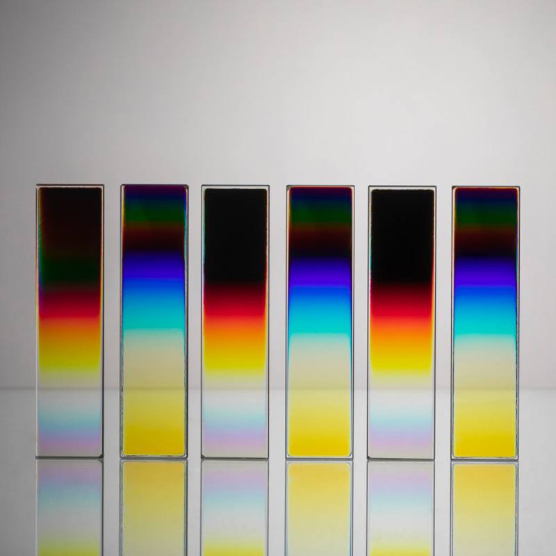 A continuously variable filter (CVF)—also known as a linearly variable filter—is a wedge-shaped interference filter whose spectral properties vary continuously along one dimension. You determine the desired wavelength by shifting the filter (and, depending on the optics, also rotating it) instead of replacing the filter. Delta Optical Thin Film is a specialist in this field.